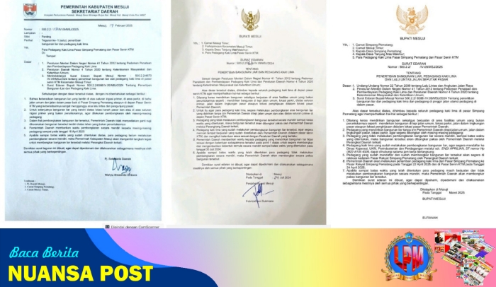 - Surat Teguran Penertiban Bangunan Liar dan Pedagang Kaki Lima Nomor: 500.2.2/1172/IV.09/MSJ/2025. di buat tanggal 17 Februari 2025. Atas Nama Penjabat Sekretaris Daerah (Sekda) Kabupaten Mesuji, Wahyu Arswendo Umbara, memberikan waktu pembongkaran secara mandiri kepada para PKL sampai batas tanggal 10 April 2025.