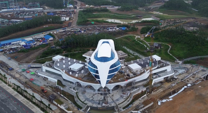 Material konstruksi menggunakan beton geopolimer dari abu sekam padi Kalimantan, mengurangi emisi CO₂ hingga 40% dibanding beton biasa[7][10].