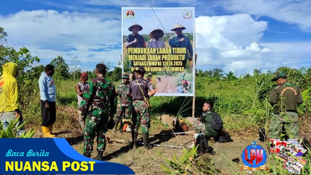 Satuan Tugas TNI Manunggal Membangun Desa (TMMD) ke-124 Kodim 1710/Mimika memperluas jangkauan kegiatan dengan membuka lahan tidur menjadi lahan produktif untuk Program Ketahanan Pangan (Hanpangan), di Kampung Naena Muktipura, Distrik Iwaka, Kab. Mimika. Rabu (07/05/2025). TMMD tahun ini selain kegiatan fisik seperti pembuatan rumah, MCK umum dan sumur bor, juga melakukan pembukaan lahan tidur untuk mendukung Hanpangan seluas 2,5 hektar.