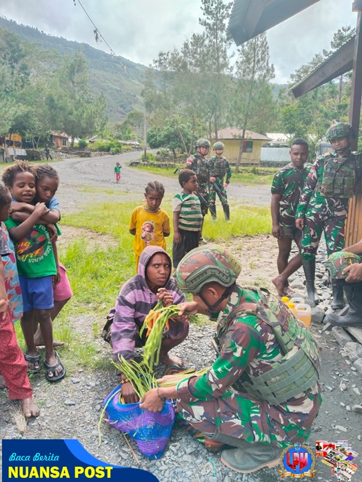 Dalam rangka mendukung program ketahanan pangan dan meningkatkan kesejahteraan masyarakat, Satgas Pamtas Kewilayahan Yonif 715/Mtl Pos Kulirik melaksanakan kegiatan borong hasil bumi masyarakat di Kampung Yalinggua, Distrik Mulia, Kabupaten Puncak Jaya, Papua, Rabu (14/05/2025).