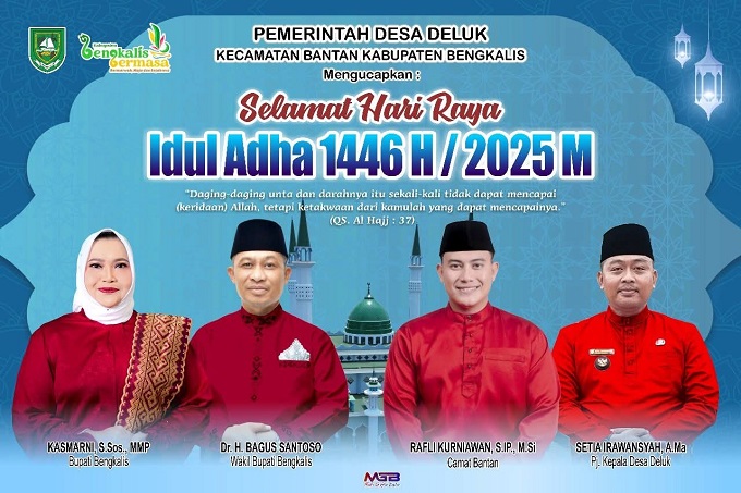 Segenap jajaran Pemerintah Desa deluk, Kecamatan Bantan, Kabupaten Bengkalis, dengan penuh sukacita mengucapkan Selamat Hari Raya Idul Adha 1446 Hijriah, bertepatan dengan bulan Juni 2025.