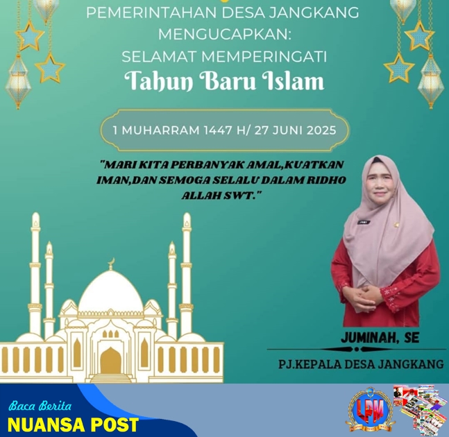 Pj Kepala Desa Jangkang Juminah.SE mengucapkan selamat Tahun Baru Islam 2025 atau 1 Muharram 1447 Hijriah menjadi momen istimewa bagi masyarakat khusus muslim di seluruh dunia. Ini bukan sekadar pergantian tahun, melainkan saat untuk merenung, memperbaiki diri, dan memperbarui niat dalam menjalani hidup sesuai ajaran Islam.