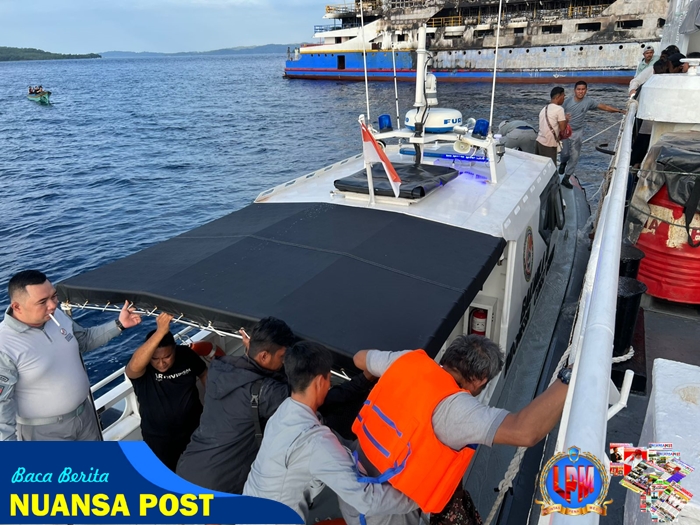 Bakamla RI melalui unsur KN Gajah Laut-404 dan HSC 32-03 melakukan aksi cepat tanggap darurat dalam membantu proses evakuasi penumpang KMP Barcelona 5 yang mengalami musibah kebakaran di perairan Pulau Talise, Kecamatan Likupang Barat, Kabupaten Minahasa Utara (Minut), Minggu (20/7/2025).