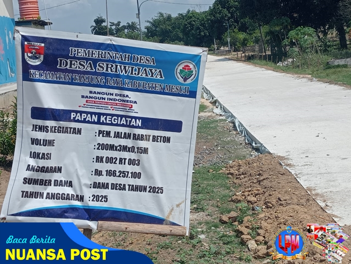 ” Untuk pembangunan desa tahun ini kita fokus dengan pembangunan infrastuktur terutama pembangunan jalan rabat beton yang berlokasi di Rk 02 dan RT 03 dengan volume Panjang 200 meter, lebar 3 meter dan tinggi 0,15meter dengan pagu anggaran sebesar Rp. 166.257.100.Selain rabat beton kami juga Pemdes Sriwijaya sudah menyelesaikan beberapa insfraktur lainya seperti sumur bor dan gapura ” jelasnya Budi , saat ditemui di ruangan balai desa ,Rabu 30 Juli 2025.