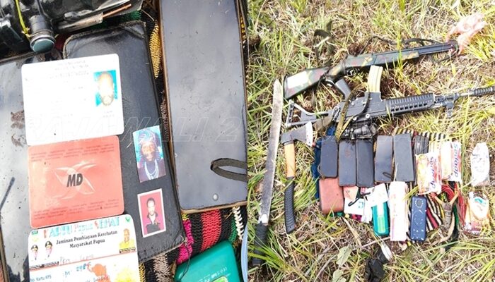 Dari lokasi kejadian, Prajurit TNI berhasil mengamankan sejumlah barang bukti diantaranya 1 pucuk senjata api jenis SS2 V4 dengan nomor senjata BF.CS 024739 beserta teleskop Trijicon SN: 923632, yang diketahui merupakan milik anggota TNI yang gugur pada tahun 2019 di sektor Ugimba, 1 pucuk senapan angin, 3 buah magazen (2 magazen M16 dan 1 magazen SS), 64 butir munisi kaliber 5,56 mm, 4 unit handphone, 1 buah dompet, 2 power bank, 1 buah emas, 1 senter kepala, Alat dan perlengkapan lainnya (kapak, parang, ketapel, korek api), Dokumen pribadi/KTP dan uang tunai jutaan rupiah, 2 buah noken dan 1 buah tas selempang.