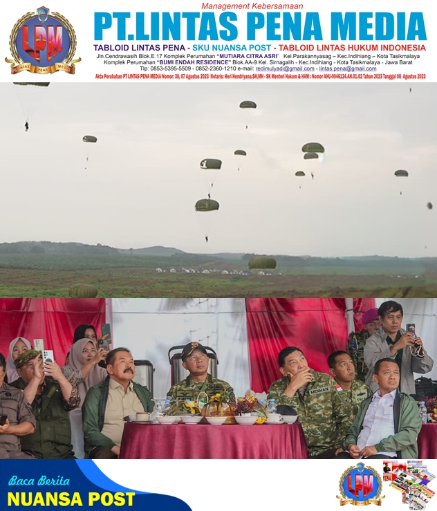BANGKA BELITUNG—- Komandan Batalyon Yonif Para Raider 501/BY Divisi 2 Kostrad Letkol Inf I Gusti Bagus Prayuda pimpin ratusan peterjun, hiasi langit Pulau Timah melaksanakan penerjunan lintas udara (linud) sebagai bagian dari latihan terpadu berskala besar yang melibatkan seluruh matra TNI yang digelar di Desa Mabat, Bangka Belitung, Rabu (19/11/2025). Kehadiran satuan peterjun Kostrad ini menegaskan kesiapan TNI dalam meningkatkan kemampuan dan proyeksi kekuatan dalam respons cepat menghadapi berbagai potensi ancaman di wilayah nasional.