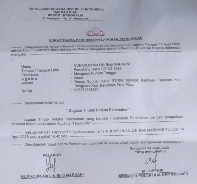 Berdasarkan Surat Tanda Penerimaan Laporan Pengaduan, pelapor atas nama Nurazlin alias Lin Binti Markani datang langsung ke Polres Bengkalis sekitar pukul 14.40 WIB, melaporkan dugaan tindak pidana perzinaan yang disebut telah berlangsung sejak Agustus 2021.