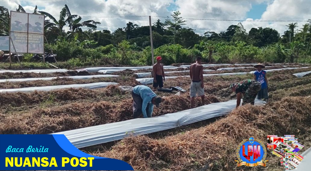 Personel Satgas TMMD 124 Kodim 1710/Mimika bersama warga dari Kelompok Tani (Poktan) “Noken Naena” melaksanakan pembersihan dan pemasangan Plastik Mulsa lahan ketahanan pangan untuk mengejar target tanam, bertempat di lokasi pembukaan lahan tidur di Kp. Nena Muktipura, Distrik Iwaka Kab. Mimika, Sabtu (24/05/2025).