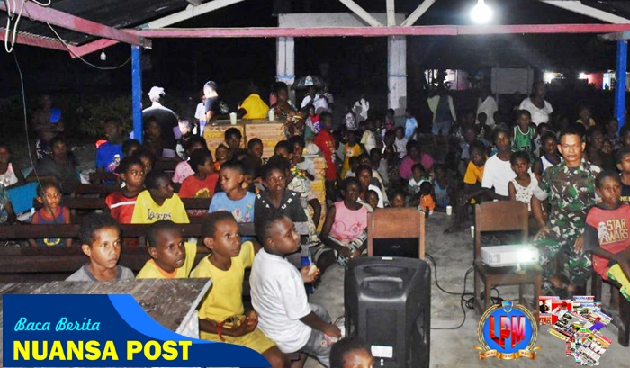 Suasana kebersamaan tampak kental saat Satuan Tugas (Satgas) TNI Manunggal Membangun Desa (TMMD) ke-124 Kodim 1710/Mimika menggelar kegiatan nonton bareng (nobar) film pembangunan bersama warga, di Kampung Pigapu, Distrik Iwaka, Sabtu malam (31/5/2025).