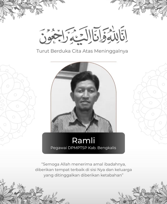 Bupati Bengkalis Kasmarni atas nama pribadi dan Pemerintah Kabupaten Bengkalis beserta jajaran menyampaikan ucapan belasungkawa yang mendalam atas wafatnya Ramli bin Rusli (Staf DPMPTSP Kabupaten Bengkalis).