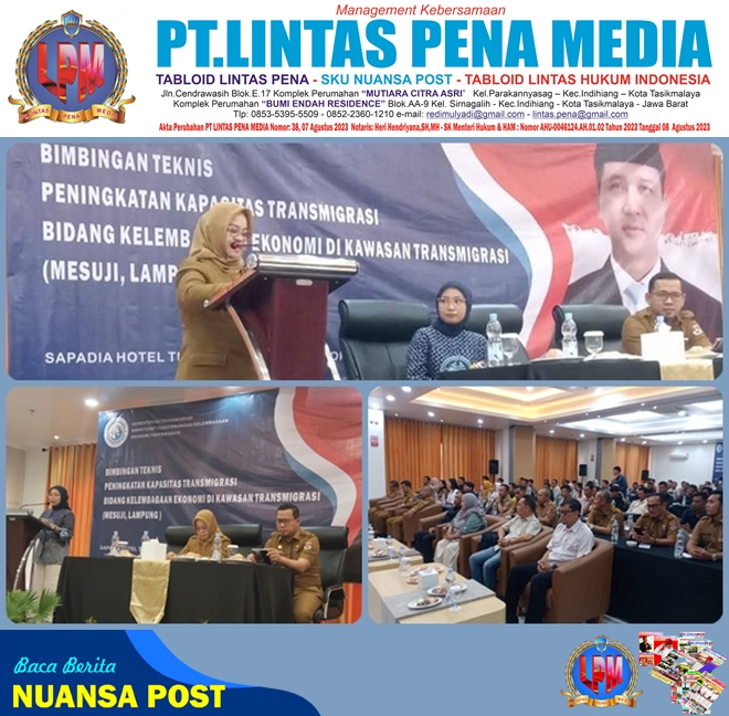 MESUJI— Bupati Mesuji Hj. Elfianah, SE secara resmi membuka Kegiatan Bimbingan Teknis (Bimtek) Bidang Kelembagaan Ekonomi dan Kewirausahaan Kawasan Transmigrasi Mesuji, yang diselenggarakan oleh Direktorat Pengembangan Kelembagaan Ekonomi Transmigrasi, Kementerian Transmigrasi, bertempat di Hotel Sapadia, Kecamatan Banjar Margo, Kabupaten Tulang Bawang, pada Selasa (14/10/2025).
